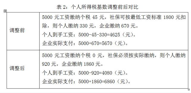 對比結論:上調個稅基數后,個人實際收入減少,4080元<4625元;企業實際負擔增加,6860元>5670元。