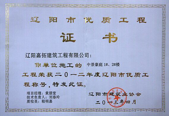 2012年度遼陽市優(yōu)質(zhì)工程